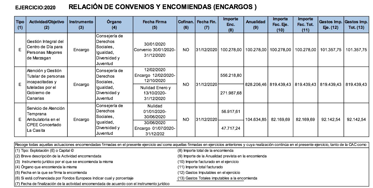 En este sentido, se relacionan todos los encargos y las aportaciones dinerarias o subvenciones recibidas en el ejercicio 2020, así como aquellas recibidas en ejercicios anteriores y cuyo plazo de aplicación y/o justificación continúa en el referido ejercicio, tanto de la Comunidad Autónoma de Canarias como de otras instituciones.