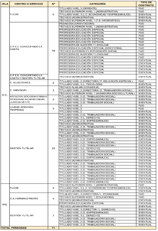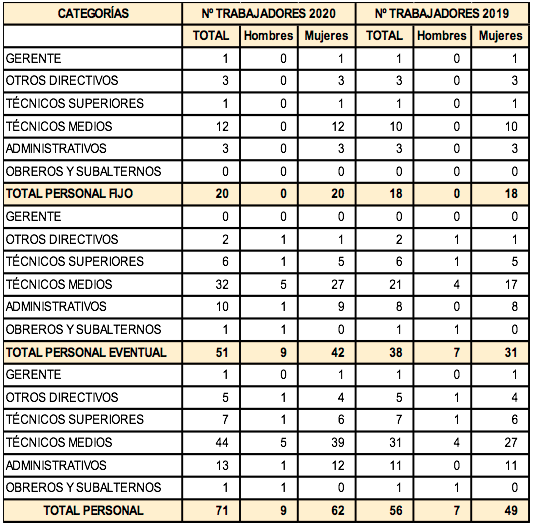 El número medio de trabajadores durante el ejercicio 2020 ha sido de 54,97. El número total de trabajadores que han prestado sus servicios en la Fundación en 2020 es de 71. Han causado alta 17 trabajadores, 4 en el Encargo del Servicio de Atención Temprana Ambulatoria en el CPEE Concertado La Casita, 8 en el Encargo para la Realización de Funciones correspondientes a la Protección y Guarda de la Persona y de los Bienes de los Mayores Incapacitados cuando por sentencia judicial firme le sea asignada su tutela legal a la Administración Autonómica de Canarias, 1 en los Servicios Generales de la Fundación Tutelar Canaria para la Acción Social, M.P., 3 en el Proyecto de Atención Sociosanitaria a Personas Incapacitadas Judicialmente y 1 en el CPEE Concertado La Casita. También han causado alta y baja 9 trabajadores para sustituciones temporales en 2020.