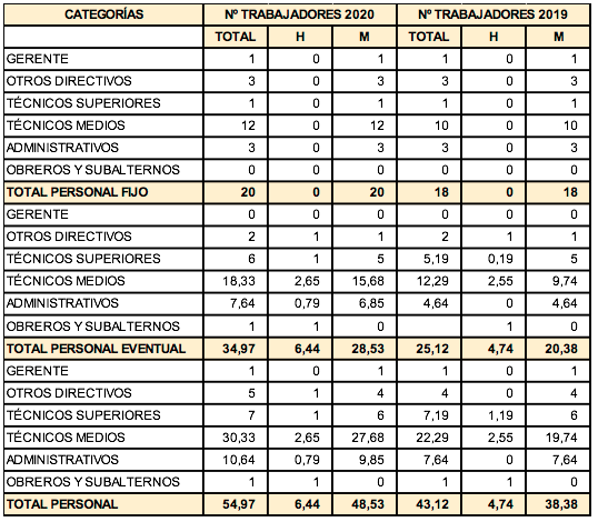 El número medio de personal empleado por la Fundación durante los ejercicios 2019 y 2020, se expresan, por categorías y sexo, en el siguiente cuadro: