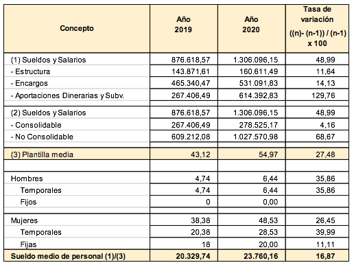 El sueldo del personal de alta dirección de la Fundación Tutelar Canaria para la Acción Social, M.P., durante el año 2020 ascendió a 46.561,95 euros, correspondiente a la retribución de la Gerente de la Fundación. Los miembros del Patronato no reciben dietas ni remuneraciones de cualquier clase por la realización de su labor como miembro del órgano de gobierno, sean económicas o en especies, ni en materia de pensiones o como primas de seguro de vida, ni indemnizaciones por cese en su labor.